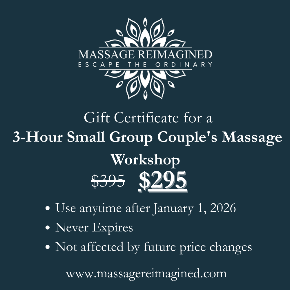 This is a gift certificate for one couple to attend a Power of Touch Small Group Couple’s Massage Workshop. There is no expiration date, and it is not affected by future price changes.