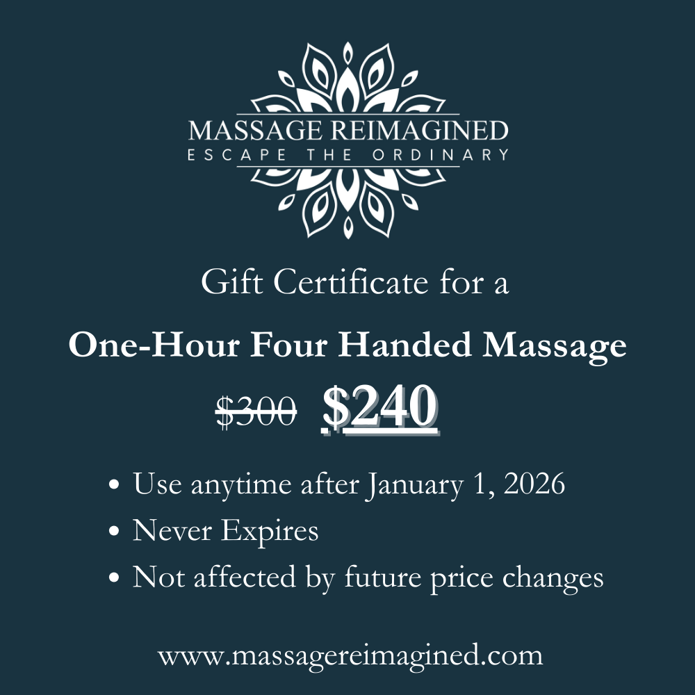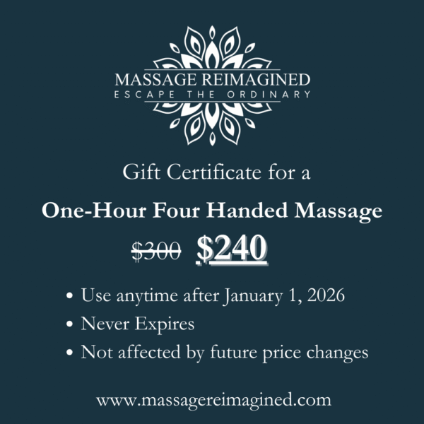 This is a gift certificate for a One-Hour Four-Handed Massage at any of our practices. It can be used any time after January 1, 2026. There is no expiration date, and it is specifically for the service, so it is not affected by future price changes.